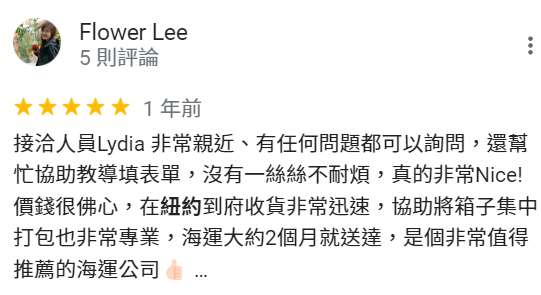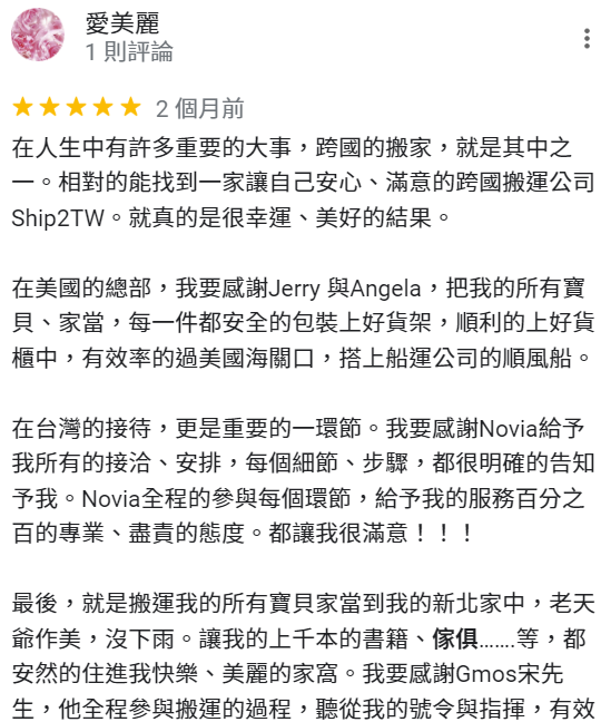 上圖是李小姐這次跨國搬家後在google map上給我們留下推薦5星好評截圖,也謝謝她對我們海運服務的推薦。看更多為何ship2tw是大家推薦國際運送搬家公司!
