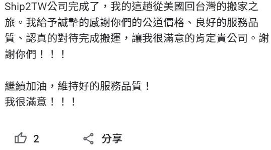 上圖是B小姐這次國際私人物品和傢俱運送後在google map上給我們留下推薦5星好評截圖還有超級詳細的海運過程經驗分享,真的非常謝謝她對我們傢俱運送服務推薦。 點此了解Ship2TW全方位的服務項目說明