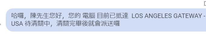 陳先生說真的非常謝謝我們幫他把電腦準時送加州辦公室,他說有機會絕對會推薦我們的服務給需要的朋友 SHIP2TW的公司評價!