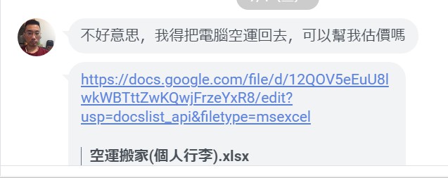 丈量過陳先生的電腦外箱呎吋跟重量後,決定幫陳先生用國際快遞空運寄送