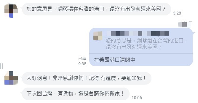李女士的鋼琴在經過專業的打包和運輸後,完好無缺地送達加拿大。她對Ship2TW的服務表示非常滿意,不僅因為鋼琴毫髮無損,更因為在整個運輸過程中,Ship2TW都保持著與她的密切聯繫,讓她能隨時了解鋼琴的動態。