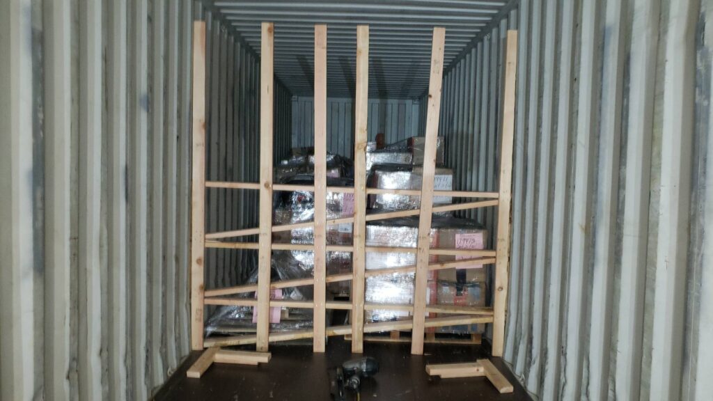 如下圖是我們先將其他客戶們要從台灣出口到加拿大的個人行李先用煙燻木條跟比較重的鋼琴分開的固定裝置