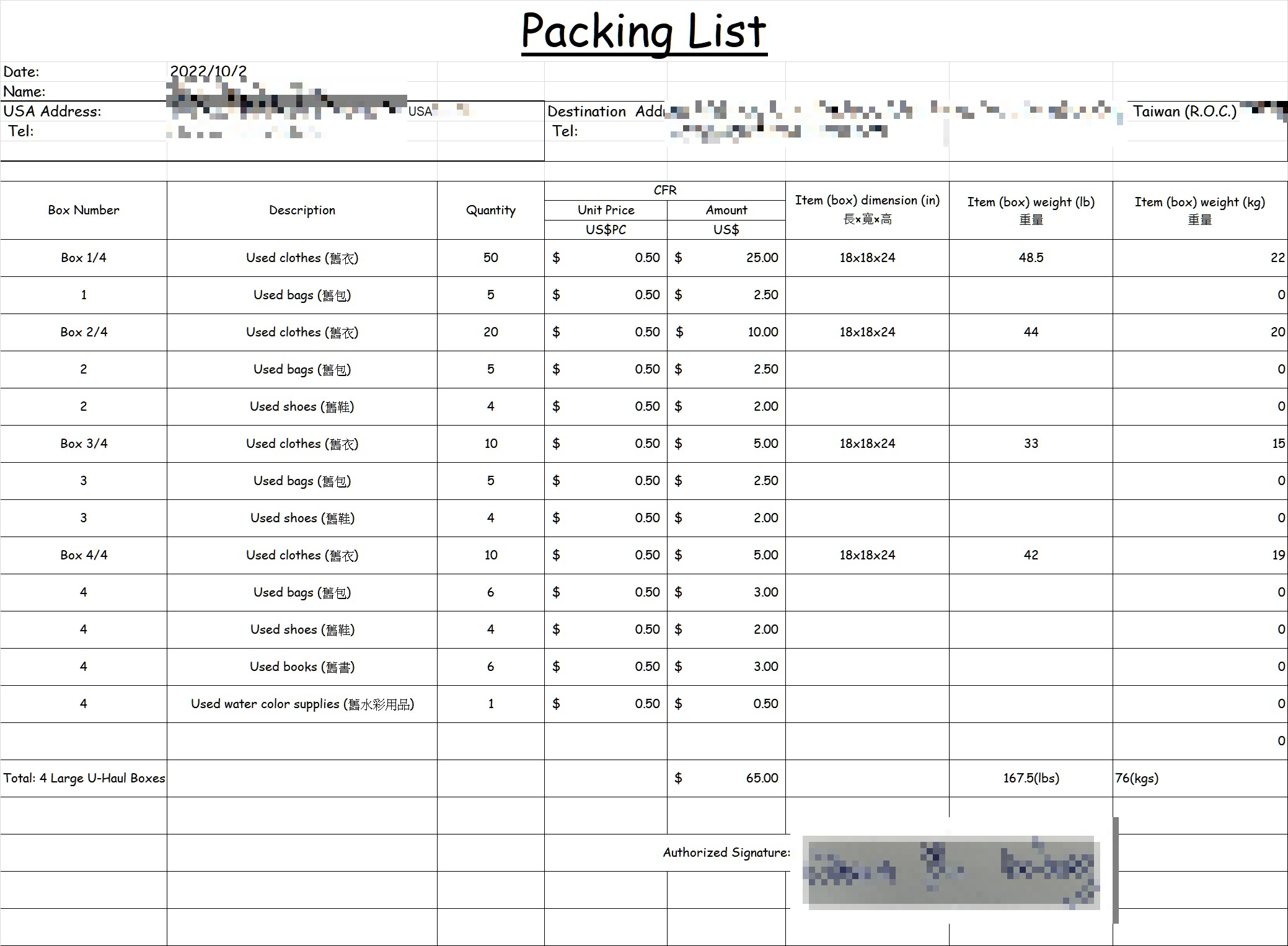 下圖是客戶從美國空運回台灣高雄個人貨品4箱總共約76kg,ship2tw收費總共700美金包含報關和運送到府服務。