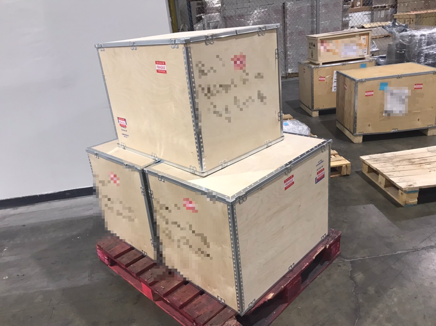 右圖是美國客人想要搬運實驗室器材跟化妝品類商品,委託我們上門取貨後訂製特殊煙燻木箱,進行防潮防撞處理,機器等在加州洛杉磯倉庫的照片