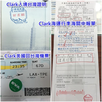 上圖是Clark回台灣的機票. 入境戳章(證明)及海關申報關