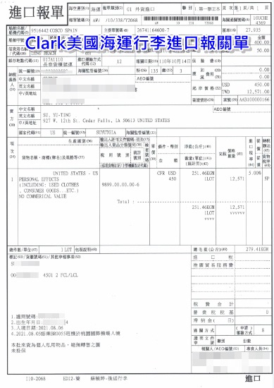 上圖是華僑Clark 從美國洛杉磯出口海運回台灣行李進口報關單