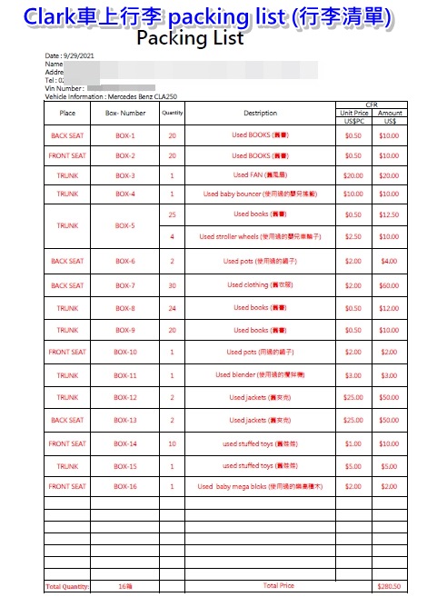 海運行李重要文件之一,美國行李寄回台灣報關時, 海關會檢視這份行李清單(packing list)