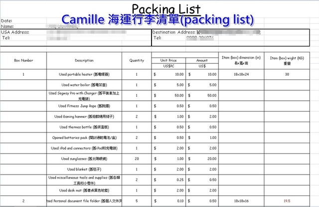 上圖是Camille的美國海運物品清單,這也是回台灣報關時重要文件之一喔!