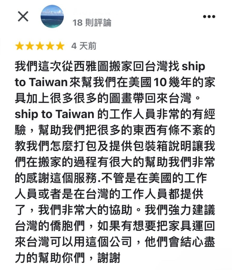陳小姐在美國居住幾十年,今年考量育兒人手、教育環境要搬遷回台灣高雄,十幾年的美國西雅圖住宅有許多心愛的傢俱、珍藏的畫作和習慣使用的生活用品,因為跨國搬運一事決定地倉促,原先預計要先帶小孩返台,待安頓好孩子們再飛一趟美國西岸處理搬家事宜,再詢問Ship2TW之後,Ship2TW竟然可以在一周內為她迅速安排這些複雜的事情,所以陳小姐決定委託Ship2TW為她規劃跨國搬家事宜!