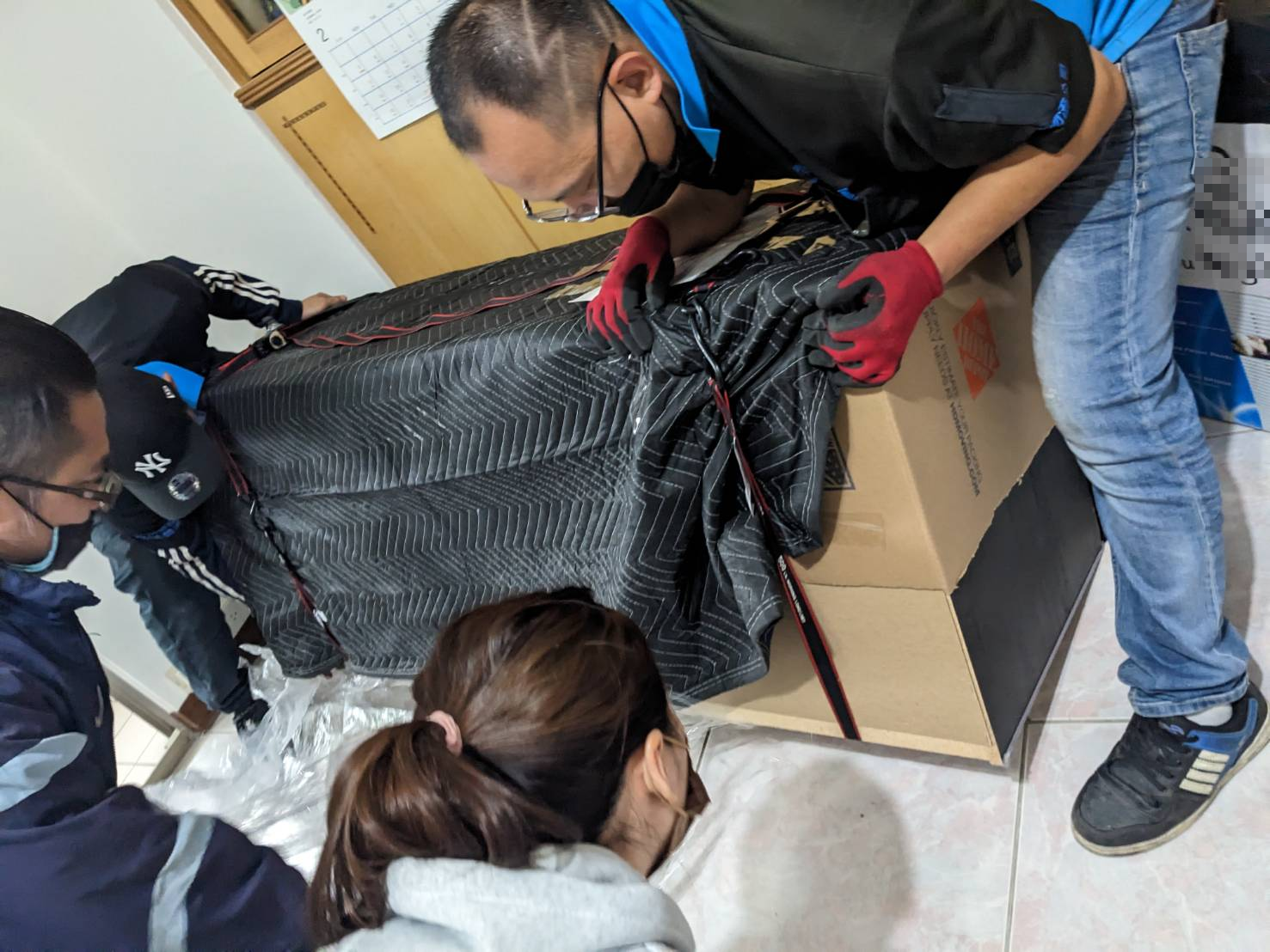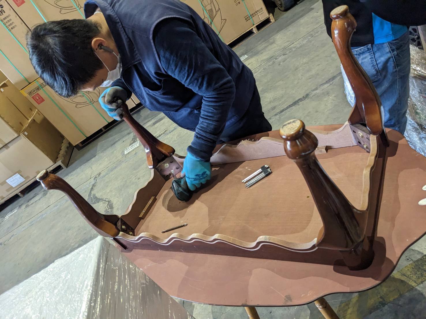 下圖是取貨後由專業師傅判別家具是否可以拆解,可以固定於棧板上增加安全性!